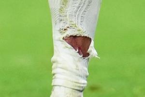 赛后照片显示,姆巴佩小腿袜被踩破露出血痕。