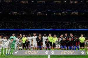 皇马官推晒出赛前反种族歧视活动的合影,并配文:“团结起来反对种族歧视。”